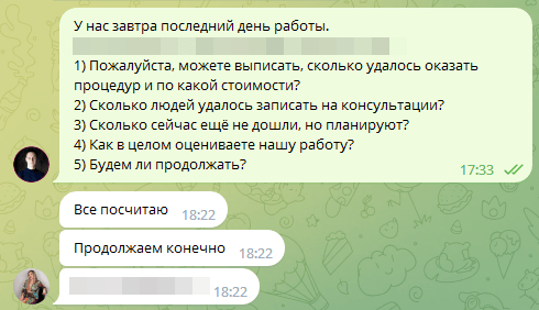 → На момент 18.02.2023 записались 45 человек на консультации, дошли на консультации 29 человек 8 человек оплатили 1 зону за 180€ и 2 человек 2 зоны за 330€. Продаж на 2100€ всего. 1 девушка из тех, кто оставил заявку на услугу, хочет прийти на обучение перманентному макияжу за 1800€.