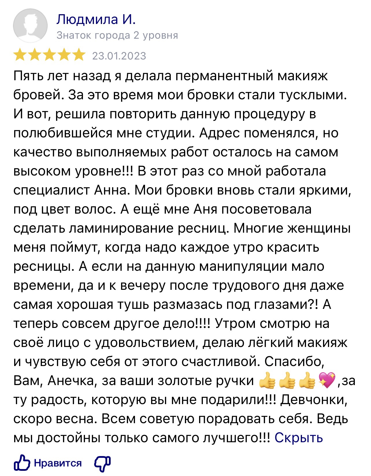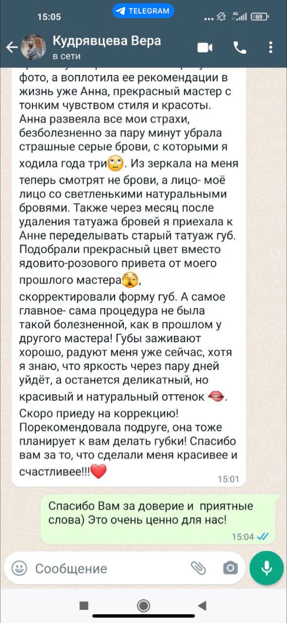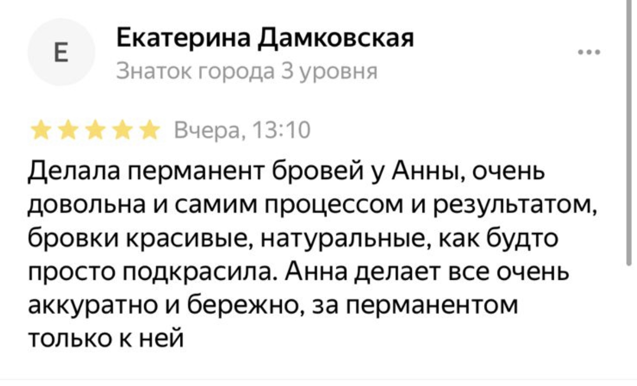 У меня нет цели получить деньги и сделать процедуру, я хочу, чтобы вы ушли более уверенной в себе и счастливой. Обычно так и выходит –  девушки восхищаются на весь салон, для меня это показатель качества. Лучше сделать, чем 100 раз услышать – жду вас на консультации!