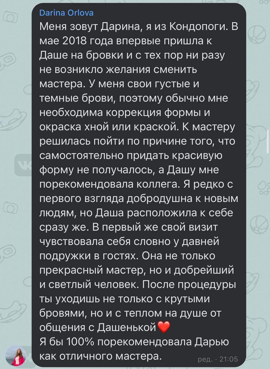 Гарантирую не только идеальный образ на 1,5 года, но и отличное настроение от визита. Снабдим понятными инструкциями и поможем справиться с волнением.