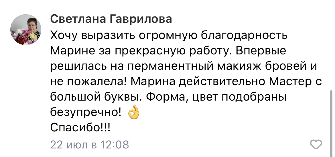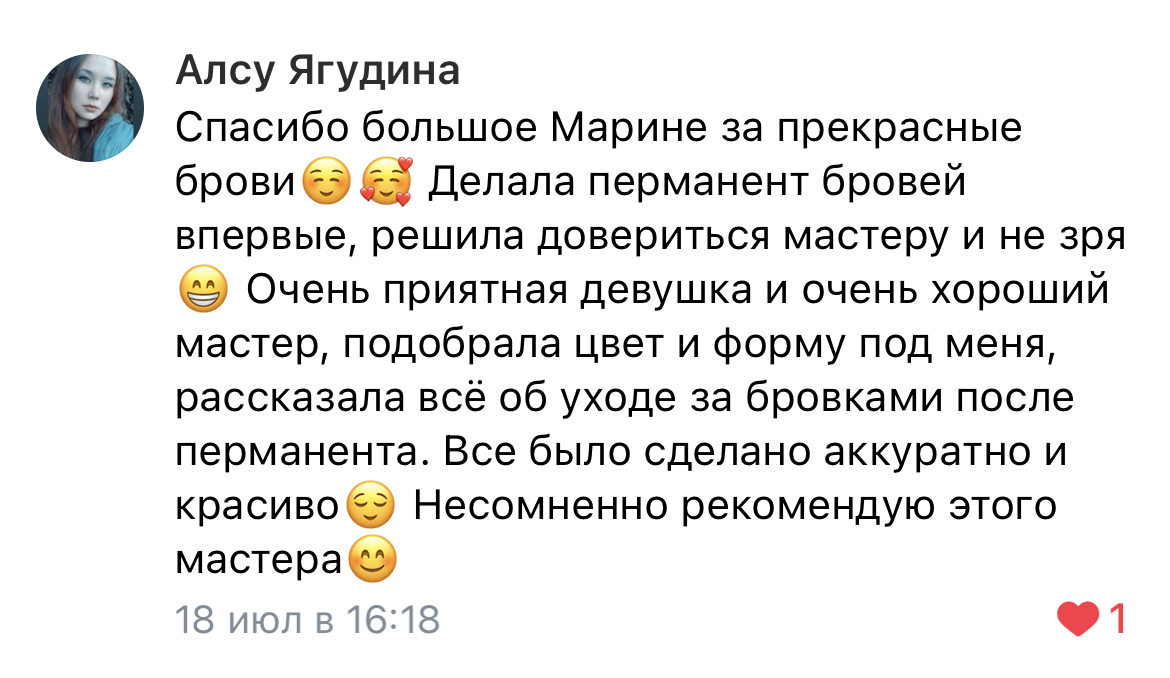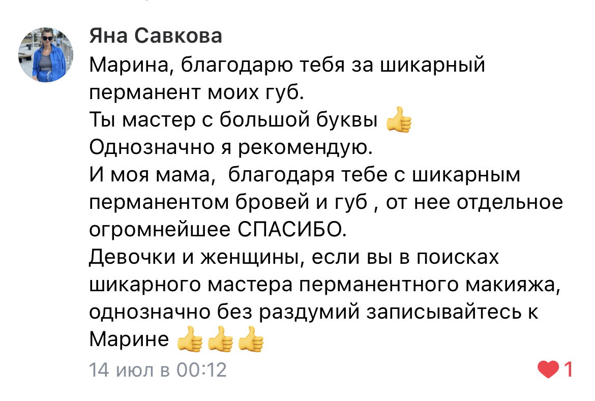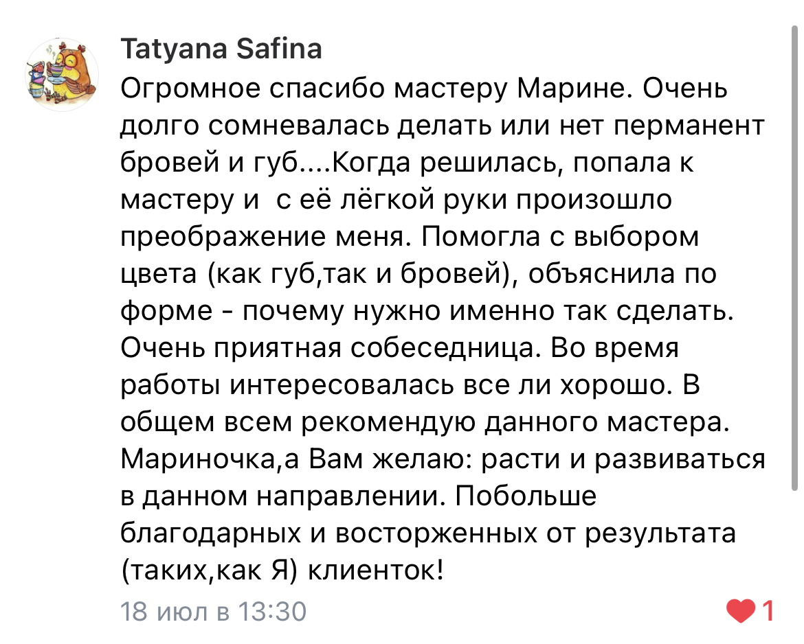 Я отталкиваюсь от природной формы, чтобы брови, губы и веки смотрелись гармонично и сохраняли индивидуальность. 97% девушек рекомендуют меня своим друзьям.
