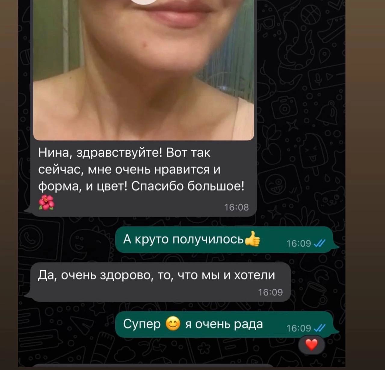 Важно, чтобы татуаж полностью совпал с вашим представлением о нем. Поэтому на бесплатной консультации вы вместе с Ниной отрисуете форму будущих бровей, губ или век, а затем подберете цвет.