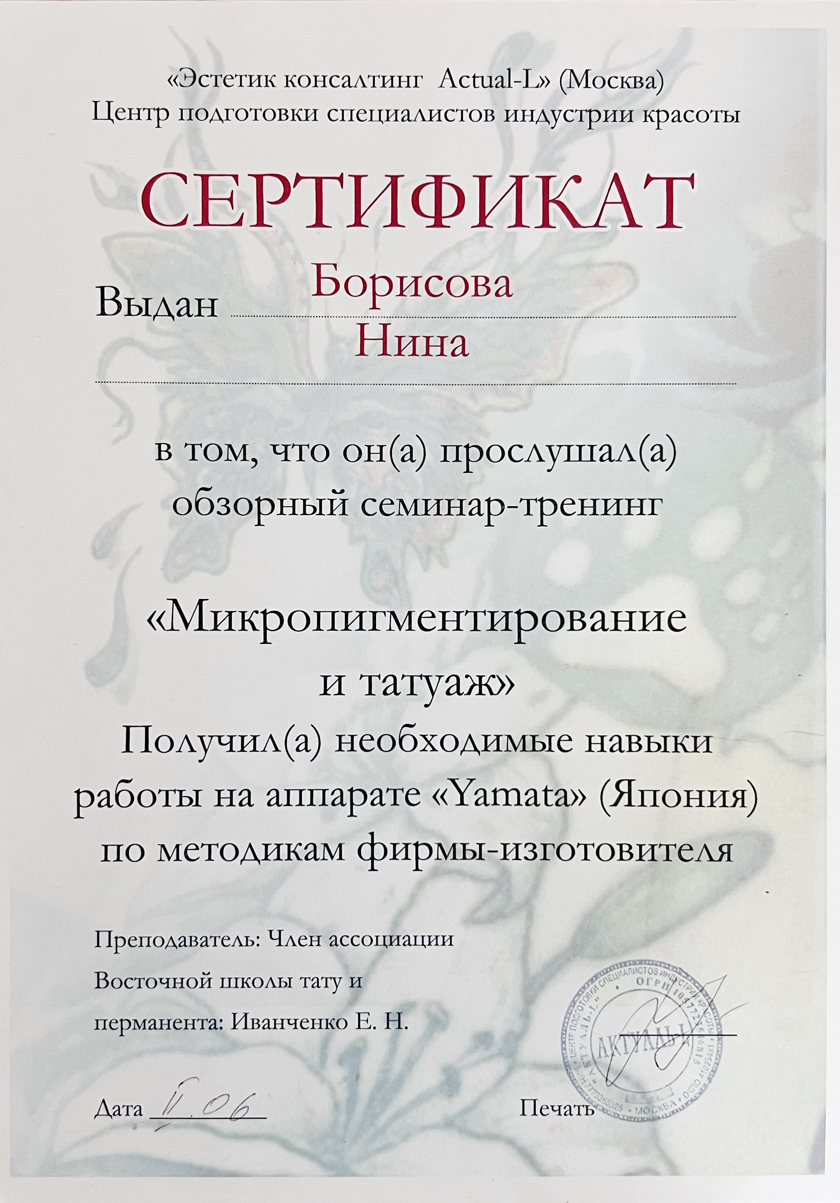 • Тату-студия, курс – перманентный макияж, мастер перманентного макияжа (г. Пекин, Китай, 2008 г.).