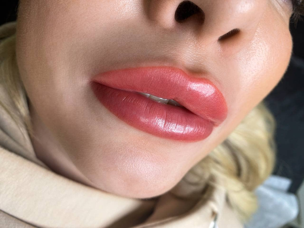 Опыт и идеальное видение формы позволяет немного выходить за красную кайму губ с целью скорректировать асимметрию, но все зависит от исходных природных данных.